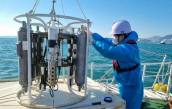 工作人員在韓國釜山海域進行海水采樣。韓國海洋水產部供圖