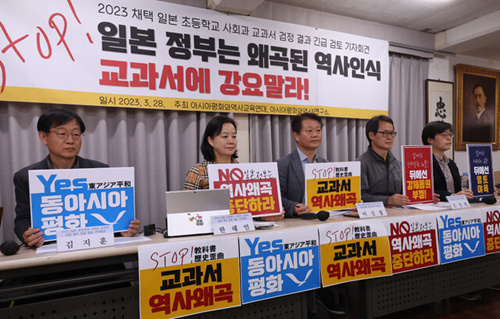 3月28日下午,韓國亞洲和平與歷史教育連帶協會在首爾市鐘路區緊急召開記者會,譴責日本教科書審定結果。圖源:韓聯社