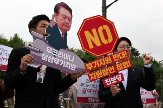韓國進步黨黨員當地時間20日下午在首爾龍山區舉行記者招待會,譴責尹錫悅對烏克蘭的軍事支援言論,并反對向烏克蘭提供殺傷武器。圖源:韓媒