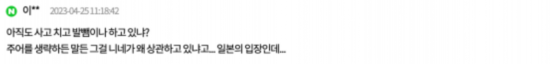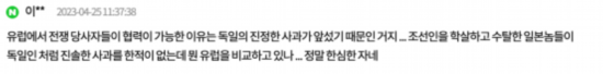 “在歐洲,戰爭當事國之所以能夠合作,是因為德國先真正道歉了...屠殺和掠奪朝鮮人的日本鬼子們從來沒有像德國人一樣真誠地道歉過,還拿歐洲做什么比較呢...你真是讓人寒心啊”↓