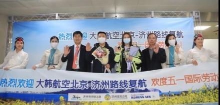圖為5月1日,中國游客乘坐時隔3年多復航的濟州至北京航線抵達濟州國際機場,受到濟州觀光公社和大韓航空相關人士等的歡迎。 圖源:韓媒