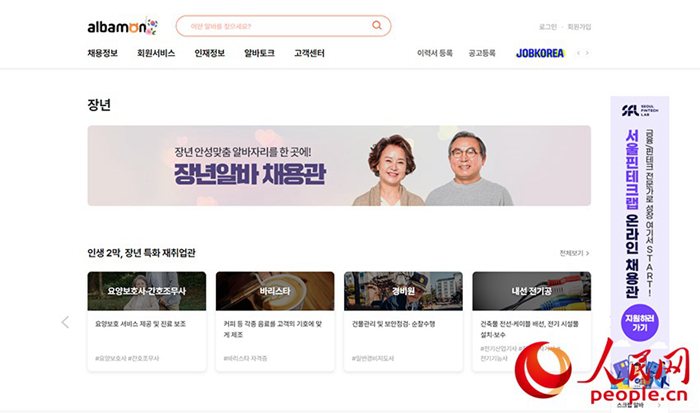 老年人招工信息出現在韓國求職網站首頁顯著位置。圖源:Albamon網頁截圖