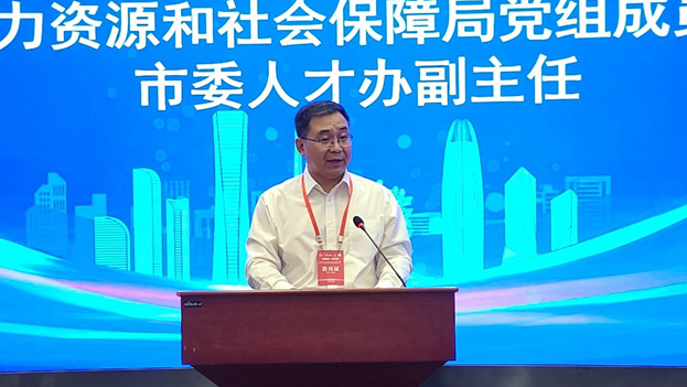 濟南市人力資源和社會保障局黨組成員、副局長、市委人才辦副主任張維國在開幕式濟南會場上發表致辭。濟南市槐蔭區供圖