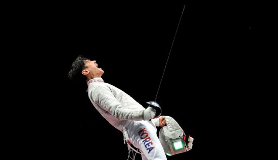2021年7月28日,韓國選手具本佶在比賽中。當日,在東京奧運會擊劍項目男子佩劍團體決賽中,韓國隊戰勝意大利隊奪冠。新華社記者 李明 攝