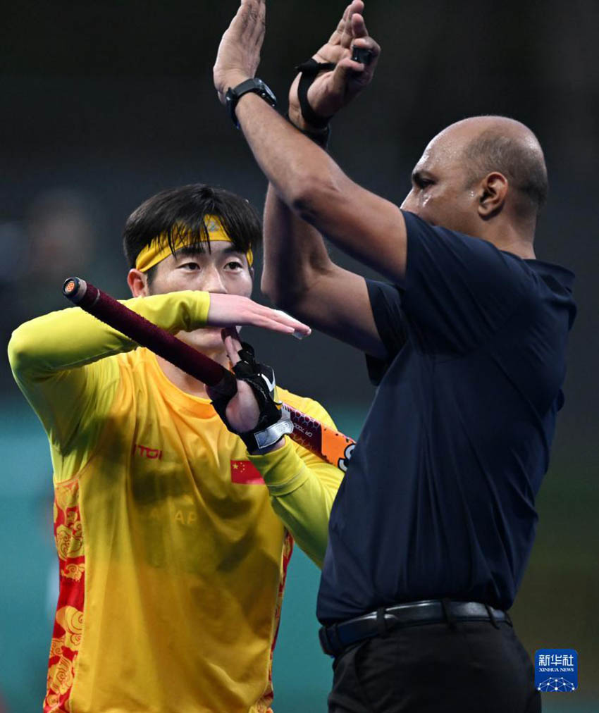 10月6日,中國隊球員孟磊在比賽中和裁判交流。新華社記者 李安 攝