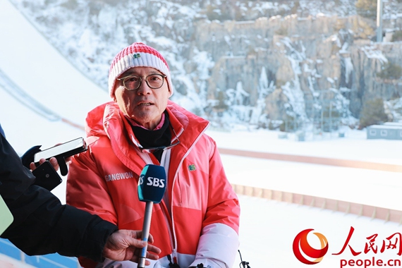 1月12日,韓國文化體育觀光部部長柳仁村在江原道平昌郡阿爾卑西亞跳臺滑雪中心接受記者采訪。人民網 實習生郭明坤攝