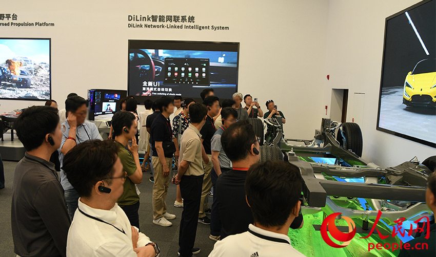 研修團一行參觀比亞迪展廳,講解員正在介紹比亞迪云輦技術。人民網 李帆攝