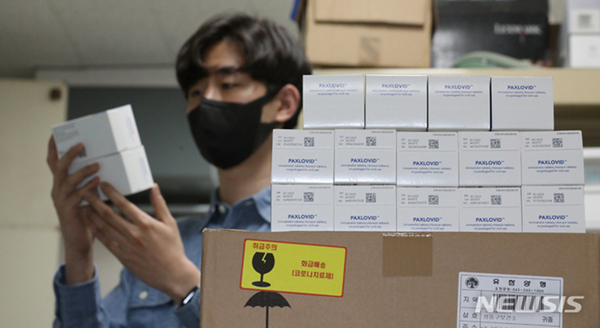 首爾某保健所,一名工作人員展示新冠口服治療藥物。圖源:紐西斯