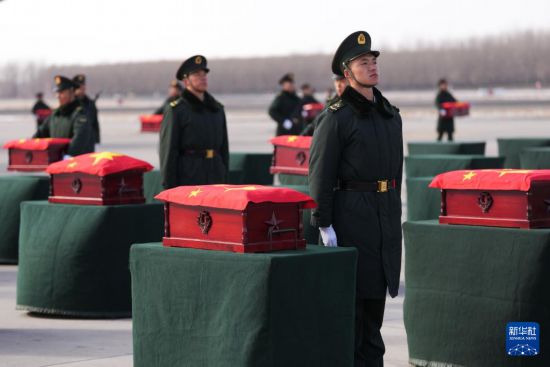 28日中午,在兩架殲-20戰斗機伴飛下,中國空軍一架運-20運輸機低速低空在機場上空通場飛行,將43位在韓中國人民志愿軍烈士遺骸從韓國仁川接回祖國。
