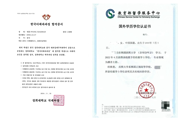 慶熙大學錄取通知書及中留服國外學歷學位認證書樣本