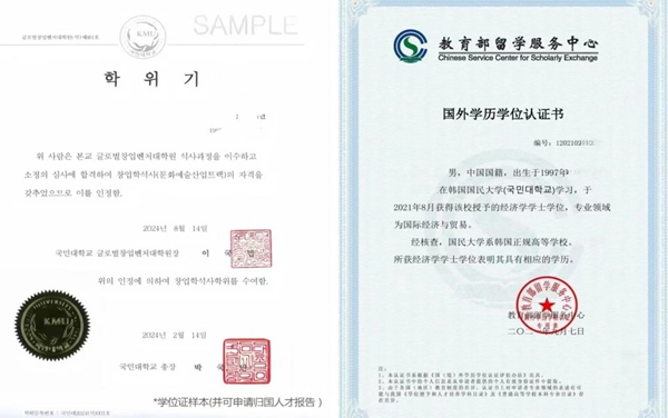國民大學碩士學位畢業證書及中留服國外學歷學位認證書樣本