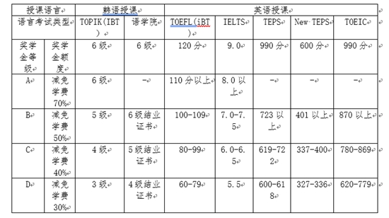?。?)英語授課:有效期內的TOEFL CBT 197, IBT 71, IELTS 5.5,TEPS 600,(新)TEPS 326 以上或與其相對應的公認的英語能力考試成績(無需提交TOPIK成績)。