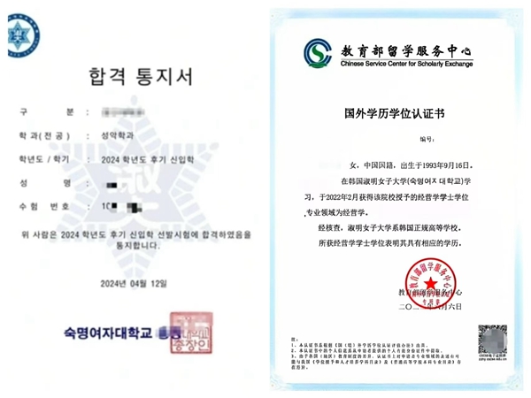 淑明女子大學錄取通知書及中留服國外學歷學位認證書樣本