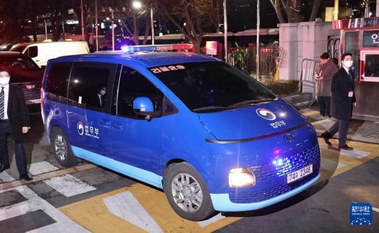 1月18日,尹錫悅乘坐的藍色車輛駛離韓國首爾西部地方法院。新華社發(全休相攝)