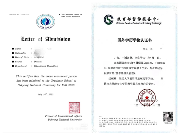 國立釜慶大學錄取通知書及中留服國外學歷學位認證書樣本