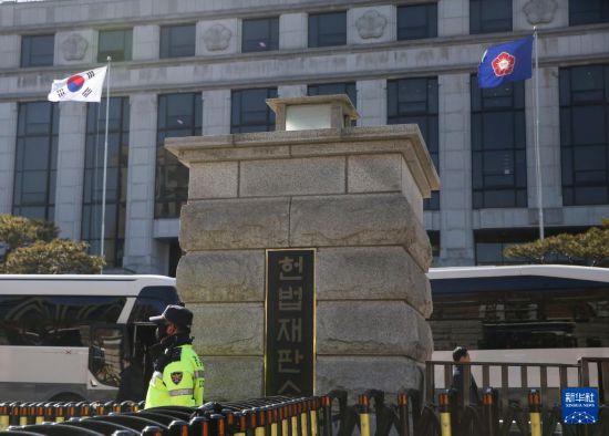 2月18日,在韓國首爾,警方在韓國憲法法院前執勤。新華社記者 姚琪琳 攝