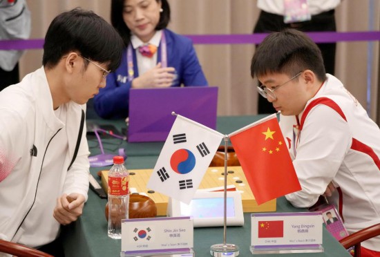 2023年10月3日,中國隊選手楊鼎新(右)對陣韓國隊選手申真谞。當日,杭州亞運會圍棋男子團體決賽在杭州棋院(智力大廈)棋類館進行,中國隊對陣韓國隊。新華社記者 韓傳號攝