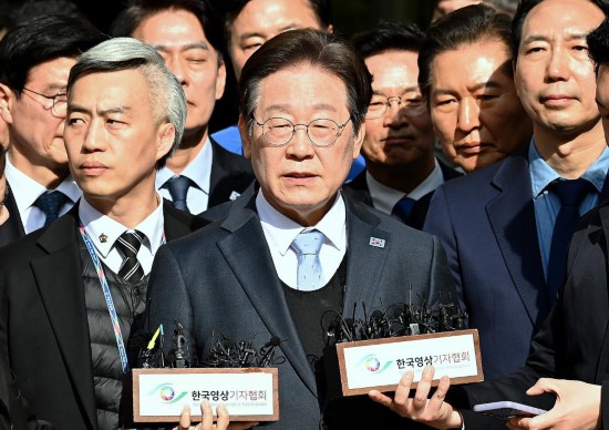 3月26日,在韓國首爾高等法院,李在明(中)在二審被判無罪后發表講話。新華社/紐西斯通訊社