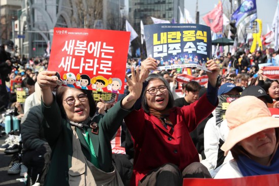 4月4日,民眾在韓國首都首爾的韓國憲法法院附近慶祝尹錫悅彈劾案獲得通過。新華社記者姚琪琳攝
