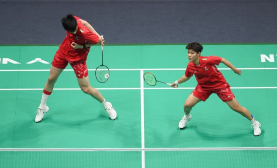 5月4日,中國隊組合馮彥哲(左)/黃東萍在比賽中。新華社記者 王楷焱 攝
