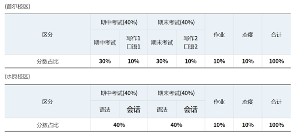 首爾校區:周一到周五9:00-14:50,260分鐘/日, 約8周