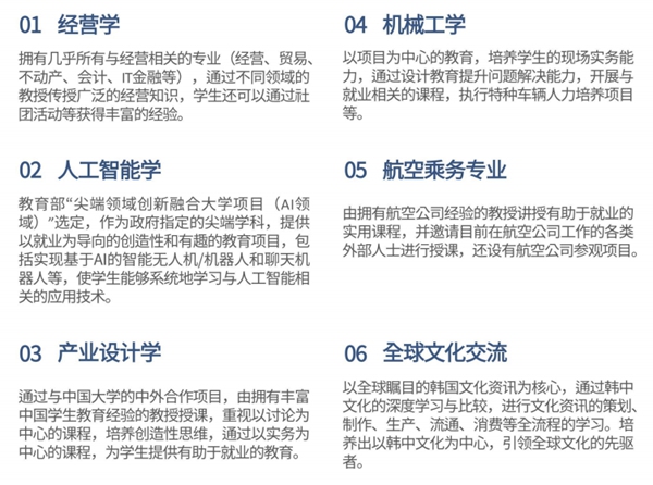 采用中國教授和韓國教授共同授課方式,各系部設置專業助教協助教學管理,畢業前開展相關就業講座、說明會等活動,針對符合條件畢業生進行韓國企業推薦就業。