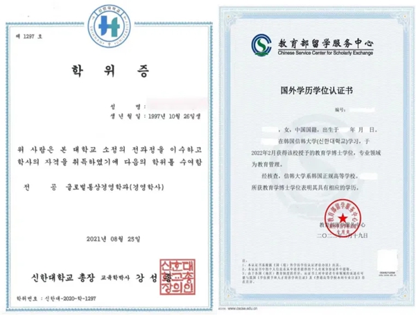 信韓大學學位證及中留服國外學歷學位認證書樣本