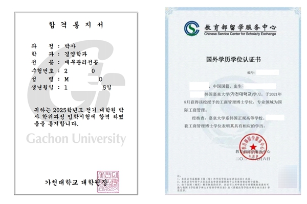 嘉泉大學錄取通知書及中留服國外學歷學位認證書樣本