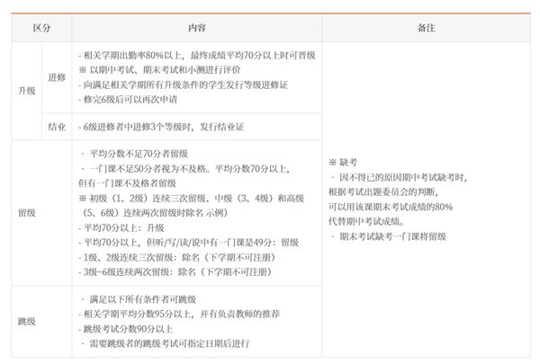 常規課程分為初級1、初級2、中級1、中級2、高級1、高級2,共6個等級。