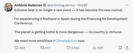 聯合國秘書長古特雷斯6月30日在西班牙南部城市塞維利亞出席聯合國第四次發展籌資問題國際會議。親身經歷西班牙熱浪的他當天在社交媒體上發文感慨:“極端高溫不再是罕見事件,它已成為新常態?!?。