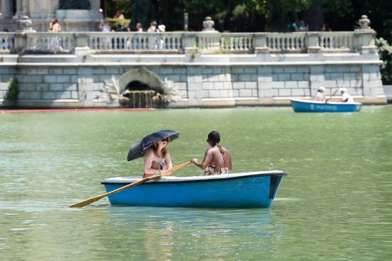 5月29日,人們在西班牙首都馬德里的一處公園內劃船。新華社發(古斯塔沃·巴連特攝)