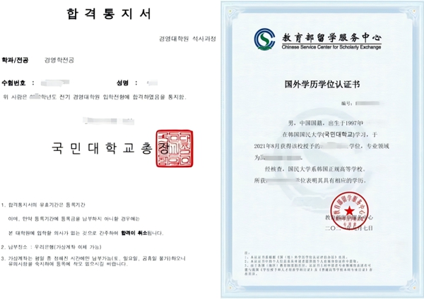 國民大學錄取通知書及中留服國外學歷學位認證書樣本