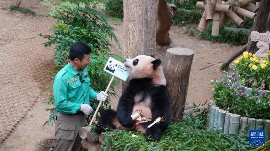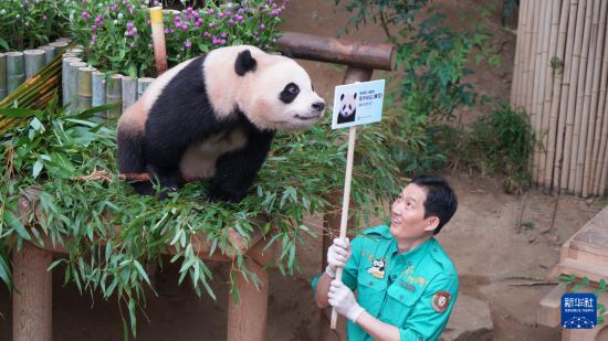 7月7日,在韓國京畿道龍仁市愛寶樂園,大熊貓“輝寶”與飼養員宋永寬互動。新華社發(孫一然攝)