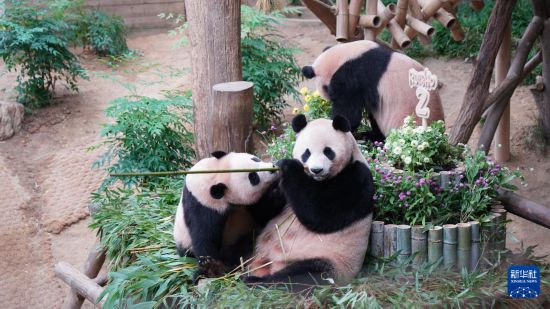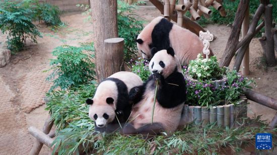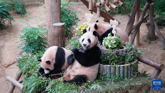 7月7日,在韓國京畿道龍仁市愛寶樂園,大熊貓“睿寶”和“輝寶”在慶生活動上吃竹子。新華社發(孫一然攝)