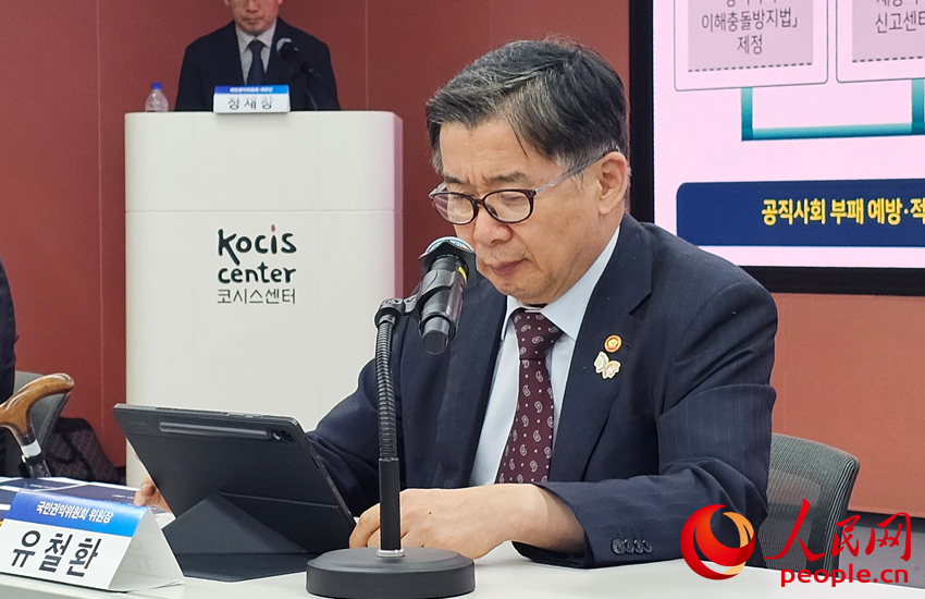 7月9日,韓國國民權益委員會委員長柳哲桓(音)在外媒記者座談會上發言。人民網 柳美鉉攝