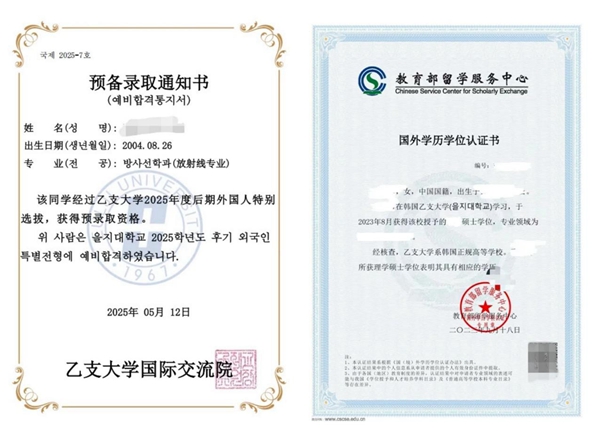 乙支大學預錄取通知書及中留服國外學歷學位認證書樣本