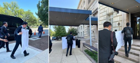 當地時間7月24日,位于華盛頓的美國商務部大樓前,韓國貿易談判團隊成員拿著用酒店桌布包裹的大型展示板,上面印有對打破韓美關稅談判僵局起到決定性作用的“MASGA”(“讓美國造船業再次偉大”)項目的介紹材料。圖源:韓媒
