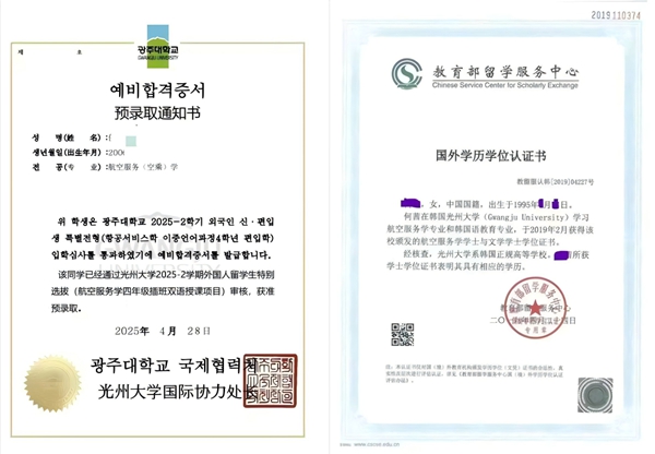 光州大學預錄取通知書及中留服國外學歷學位認證書樣本