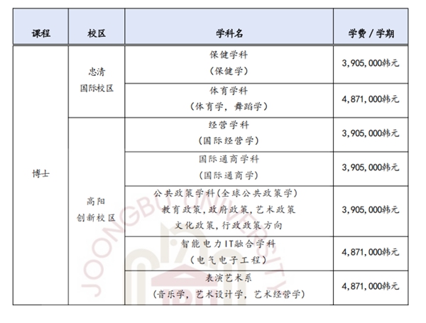 韓國中部大學2年制彈性學制雙語授課博士申請指南