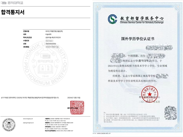 韓國弘益大學錄取通知書及中留服國外學歷學位認證書樣本