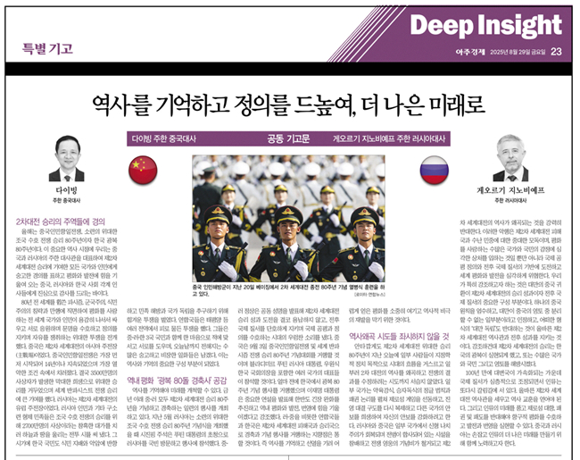 據中國駐韓國大使館微信公眾號消息,8月29日,戴兵大使與俄羅斯駐韓大使季諾維也夫在韓國《亞洲經濟》《亞洲日報》以中韓文發表題為《銘記歷史、弘揚正義,共創和平美好未來》的聯合署名文章,在中國人民抗日戰爭暨世界反法西斯戰爭勝利80周年紀念活動即將舉行之際,向包括中俄韓在內曾為二戰勝利作出貢獻的所有國家和人民表示崇高敬意,高度評價三國紀念慶?;顒右饬x,呼吁堅持正確二戰史觀,捍衛包括臺灣回歸中國在內的二戰勝利成果,摒棄零和對抗,反對霸權霸道,為維護持久和平、實現發展繁榮共同努力。全文如下: