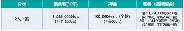 ※ 餐費:學期中提供1日3餐或2餐(包括周末)/假期餐費將另行支付