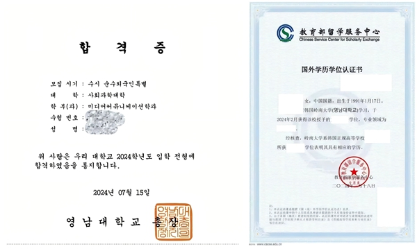 嶺南大學錄取通知書及中留服國外學歷學位認證書樣本