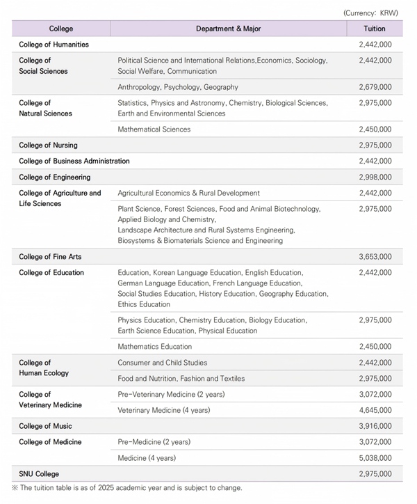 農業生命科學學院:農業經濟與社會學部(農業資源經濟學、區域情報學)、植物生產科學部(作物生命科學、園藝生物技術、產業人力資源開發學)、林業科學部(森林環境學、環境材料科學)、食品動物生物技術學部(食品生物技術、動物生物技術)、應用生物化學部(應用生物化學、應用生物學)、造景區域系統工學部(造景學、區域系統工學)、生物系統·材料學部(生物系統工學、生物材料工學)