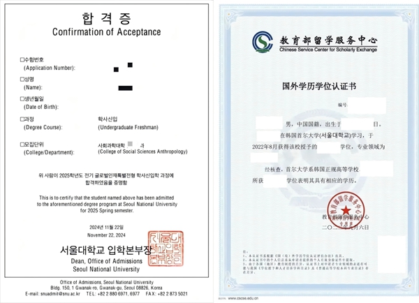 首爾大學錄取通知書及中留服國外學歷學位認證書樣本