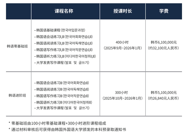 韓國外國語大學本科預科課程(Undergraduate Foundation Program)是面向高中畢業生、大專畢業生及本科在讀學生準備的大學預科課程。在未取得韓國語等級考試(TOPIK)成績之前,可先通過材料審核,獲得韓國外國語大學本科預錄取通知書后,通過本科預科課程的學習并通過考核,直接升入本科。