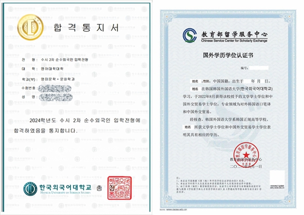 韓國外國語大學錄取通知書及中留服國外學歷學位認證書樣本