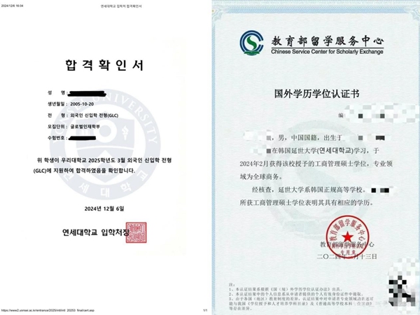 延世大學錄取通知書及中留服國外學歷學位認證書樣本