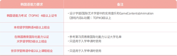 ?。?)根據本校入學政策,僅限于滿足韓國語語言能力入學基準的申請者,可升入本科課程。韓國語語言能力未達標者,入學后進入休學狀態,進入韓國語再教育班韓國語研修,韓國語語 言能力達標后復學升入本科