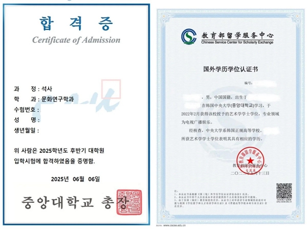 韓國中央大學錄取通知書及中留服國外學歷學位認證書樣本